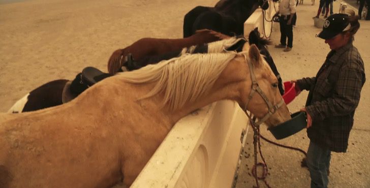 10. Personas se ofrecen a alimentar a los caballos en las playas de Malibú