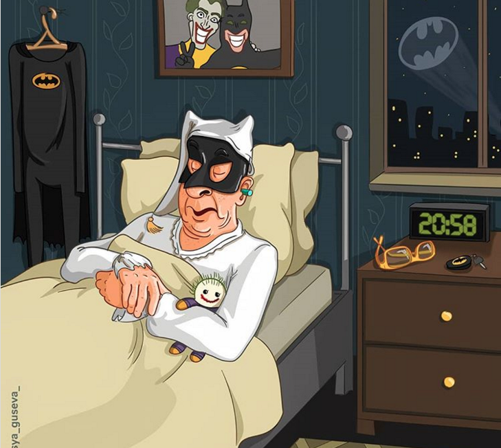 Lesya Guseva, una pintora rusa, creó su propio universo de superhéroes y villanos que ya llegaron a la tercera edad, llamado “jubilandia”, en donde retrata cómo se verían en esta etapa de su vida.